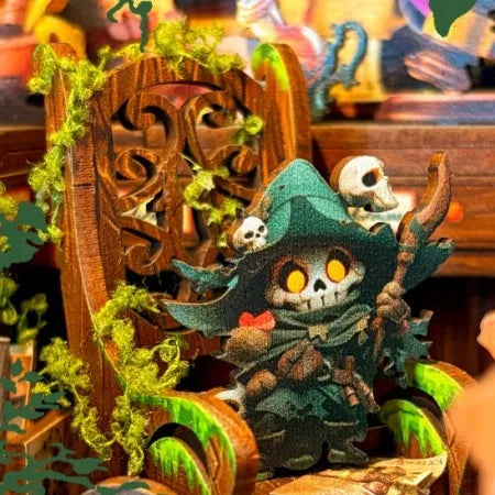 Book Nook - Alchemy Diary vous plonge dans le repaire secret de la Sorcière de la Forêt. La structure en bois détaillée, les potions magiques, les runes et les livres anciens recréent une ambiance mystique. Grâce à l’éclairage intégré, ouvrez un portail vers l’alchimie et laissez la magie illuminer votre bibliothèque !