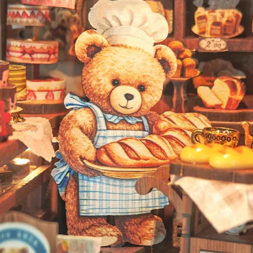 Bear Bakery Book Nook est un décor 3D miniature à insérer entre vos livres, représentant une boulangerie de conte de fées tenue par un petit ours. Chaque détail, des vitrines remplies de douceurs au chariot de pains, est soigneusement travaillé pour recréer une ambiance chaleureuse. Un cadeau idéal ou un trésor à collectionner pour embellir votre coin lecture.