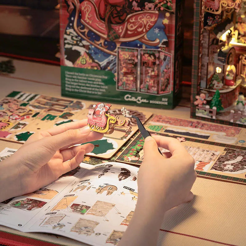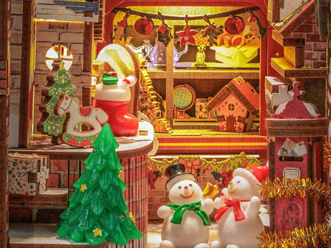Découvrez un monde miniature de Noël enchanteur dans notre Book Nook - Christmas Wish Store. Laissez-vous séduire par un sapin de Noël tournant, une petite maison remplie de cadeaux, un marché de Noël plein d'ambiance et un traîneau chargé de surprises. Le Père Noël apparaît près de la cheminée de la maison avec son sac rempli de cadeaux et apporte une chaleur réconfortante au petit village. Un mécanisme musical intégré joue des chants de Noël festifs sur simple pression d'un bouton et crée une atmosphère magique.