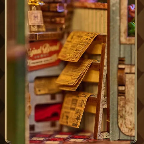 Book Nook - Magic Shop, un kit créatif pour construire un diorama miniature. Parfait pour décorer une bibliothèque ou comme cadeau original pour un amoureux des livres. Par Nookette.