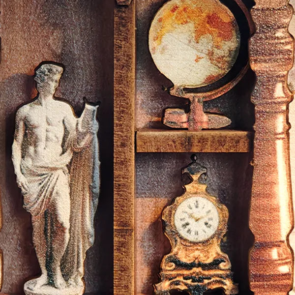 - Étagère des muses: Une collection d'objets inspirants, incluant un buste en plâtre artistique, un globe terrestre de voyageur et une horloge rétro.