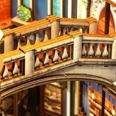 Plongez dans l’univers enchanteur de « Book Nook – Venetian Dreams » ! Cette maison miniature capture toute l’atmosphère romantique de Venise, avec une gondole richement détaillée, des violonistes en train de jouer et de charmantes ruelles. Des miroirs habilement placés créent un effet de profondeur fascinant, tandis qu’un doux éclairage LED illumine la scène d’une lueur chaleureuse – un véritable accroche-regard pour toute bibliothèque.