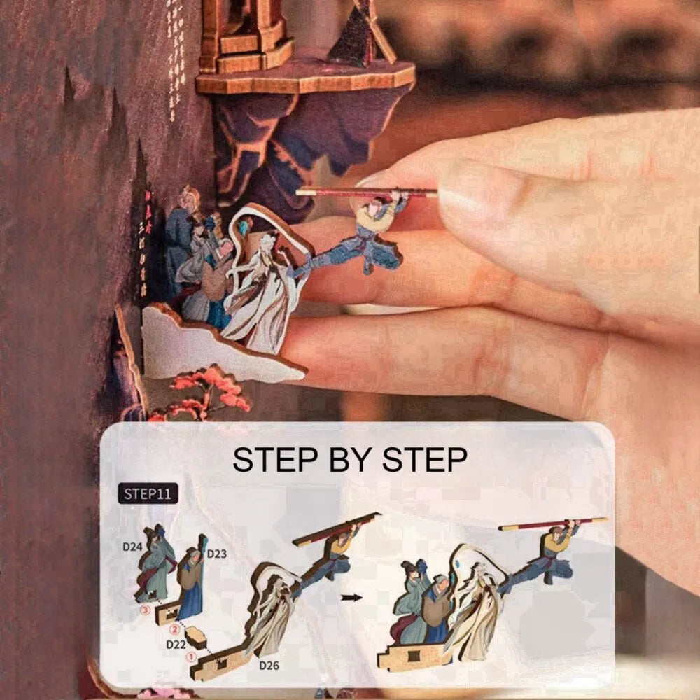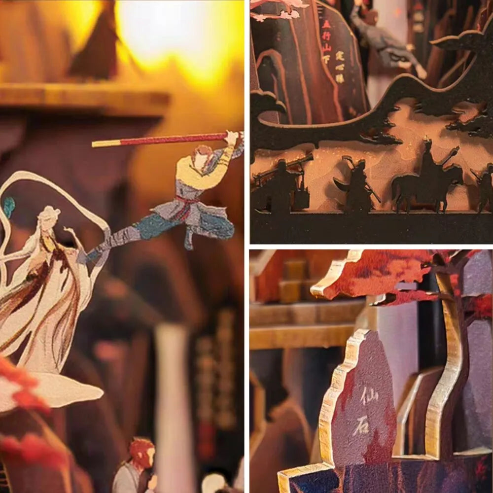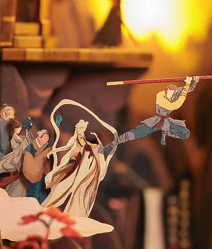 Book Nook - Wukong est un kit de construction détaillé qui donne vie à des scènes emblématiques du classique chinois « Voyage en Occident ». Le kit présente des moments légendaires tels que l'apprentissage de Sun Wukong, les trois rencontres avec la fée des os blancs et la bataille entre le vrai et le faux roi singe, et regorge du charme de la mythologie chinoise. Avec ce Book Nook à monter soi-même, vous pouvez créer vous-même ces scènes impressionnantes et revivre les aventures de Sun Wukong et Tang Sanzang sur leur chemin vers l'ouest.