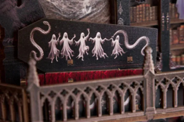 Quel sombre secret se cache entre vos livres ? Le Book Nook "Famille Sombre" brise les codes et déploie son histoire macabre dans un format paysage unique. Le regard est immédiatement attiré par la cheminée ardente et la figure d'un mage obscur.