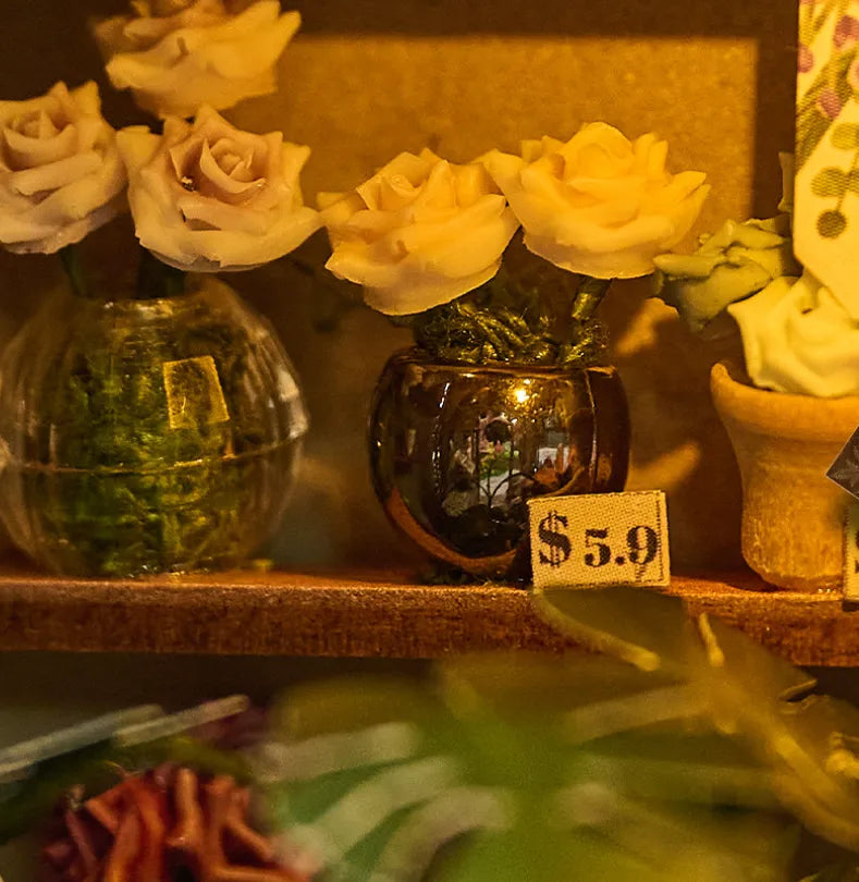 Découvrez votre atelier floral personnel niché au coin d’une charmante rue européenne. Cette maison miniature capture à la perfection l’atmosphère romantique d’une boutique de fleurs baignée de soleil. Son style unique, associé aux parois translucides couleur ambre, vous fait ressentir à chaque étape de l’assemblage la douce chaleur de la lumière de l’après-midi.